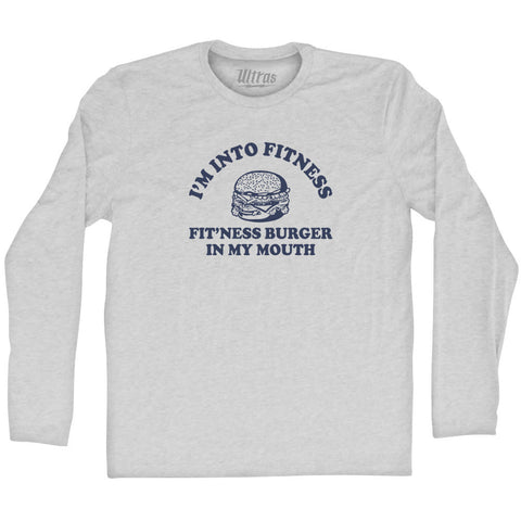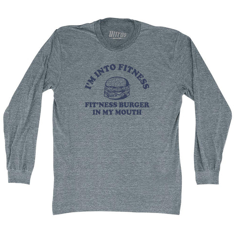 Product Story: I'M Into Fitness Fit'Ness Burger In My Mouth Adult Tri-Blend Long Sleeve T-shirtProduct Description: I'M Into Fitness Fit'Ness Burger In My Mouth Adult Tri-Blend Long Sleeve T-shirt Tri-Blend (Polyester, Rayon, Cotton) Buttery Smooth Soft Material Medium Weight Tee Soft Hand Print
