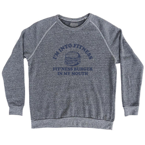 Product Story: I'M Into Fitness Fit'Ness Burger In My Mouth Adult Tri-Blend SweatshirtProduct Description: I'M Into Fitness Fit'Ness Burger In My Mouth Adult Tri-Blend Sweatshirt Tri-Blend (Polyester, Rayon, Cotton) Buttery Smooth Soft Material Medium Weight Tee Soft Hand Print