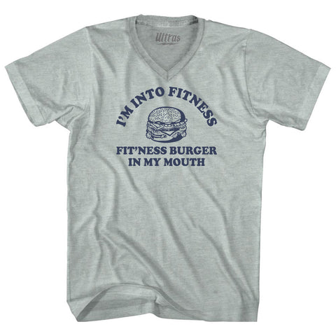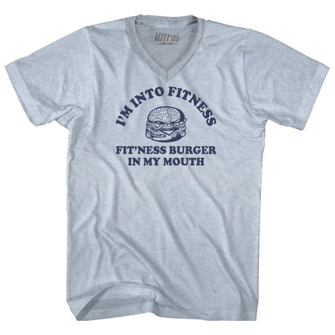 Product Story: I'M Into Fitness Fit'Ness Burger In My Mouth Adult Cotton V-neck T-shirtProduct Description: I'M Into Fitness Fit'Ness Burger In My Mouth Adult Cotton V-neck T-shirt Tri-Blend (Polyester, Rayon, Cotton) Buttery Smooth Soft Material Medium Weight Tee Soft Hand Print