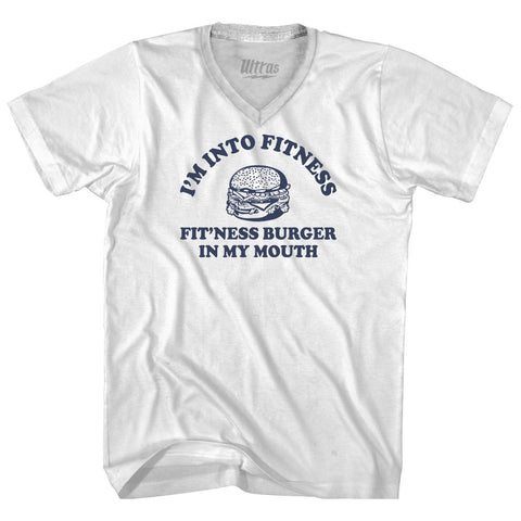 Product Story: I'M Into Fitness Fit'Ness Burger In My Mouth Adult Cotton V-neck T-shirtProduct Description: I'M Into Fitness Fit'Ness Burger In My Mouth Adult Cotton V-neck T-shirt Cotton Buttery Smooth Soft Material Medium Weight Tee Soft Hand Print