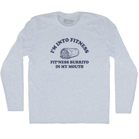 Product Story: I'M Into Fitness Fit'Ness Burrito In My Mouth Adult Tri-Blend Long Sleeve T-shirtProduct Description: I'M Into Fitness Fit'Ness Burrito In My Mouth Adult Tri-Blend Long Sleeve T-shirt Tri-Blend (Polyester, Rayon, Cotton) Buttery Smooth Soft Material Medium Weight Tee Soft Hand Print