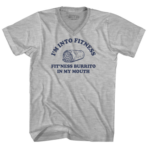 Product Story: I'M Into Fitness Fit'Ness Burrito In My Mouth Adult Cotton V-neck T-shirtProduct Description: I'M Into Fitness Fit'Ness Burrito In My Mouth Adult Cotton V-neck T-shirt Tri-Blend (Polyester, Rayon, Cotton) Buttery Smooth Soft Material Medium Weight Tee Soft Hand Print