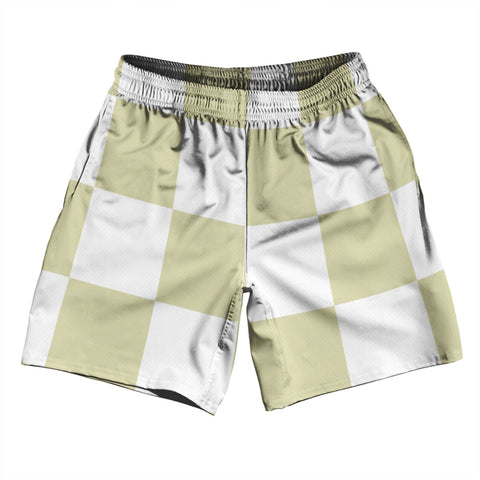 Product Story: Checkerboard 5 Inches Vegas Gold and White Athletic Running Fitness Exercise Shorts 7" Inseam Shorts Made In USAProduct Description: Checkerboard 5 Inches Vegas Gold and White Athletic Running Fitness Exercise Shorts 7" Inseam Shorts Made In USA Forever Color Sharpness Men's Gym Shorts 7 Inch Inseam Side Pockets Athletic Microfiber Great Sports Shorts Elastic Waist Draw String Durable...