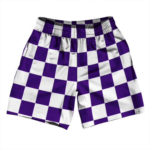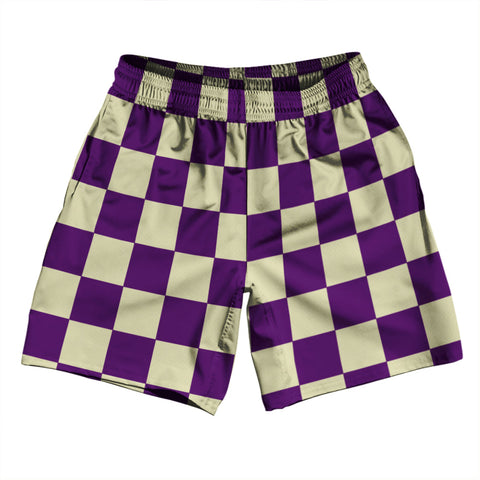 Product Story: Checkerboard 2.5 Inches Purple Lakers and White Athletic Running Fitness Exercise Shorts 7" Inseam Shorts Made In USAProduct Description: Checkerboard 2.5 Inches Purple Lakers and White Athletic Running Fitness Exercise Shorts 7" Inseam Shorts Made In USA Forever Color Sharpness Men's Gym Shorts 7 Inch Inseam Side Pockets Athletic Microfiber Great Sports Shorts Elastic Waist Draw String Durable...