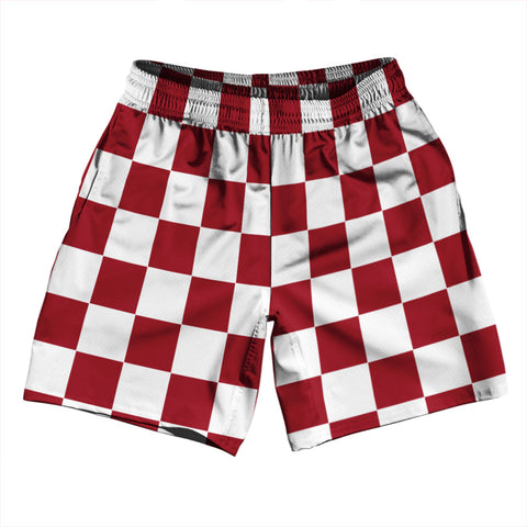 Product Story: Checkerboard 2.5 Inches Red Maroon and White Athletic Running Fitness Exercise Shorts 7" Inseam Shorts Made In USAProduct Description: Checkerboard 2.5 Inches Red Maroon and White Athletic Running Fitness Exercise Shorts 7" Inseam Shorts Made In USA Forever Color Sharpness Men's Gym Shorts 7 Inch Inseam Side Pockets Athletic Microfiber Great Sports Shorts Elastic Waist Draw String Durable...
