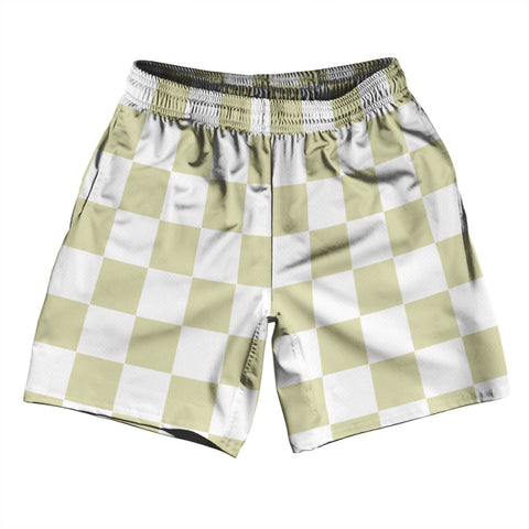 Product Story: Checkerboard 2.5 Inches Vegas Gold and White Athletic Running Fitness Exercise Shorts 7" Inseam Shorts Made In USAProduct Description: Checkerboard 2.5 Inches Vegas Gold and White Athletic Running Fitness Exercise Shorts 7" Inseam Shorts Made In USA Forever Color Sharpness Men's Gym Shorts 7 Inch Inseam Side Pockets Athletic Microfiber Great Sports Shorts Elastic Waist Draw String Durable...