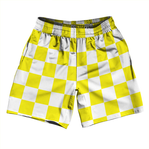 Product Story: Checkerboard 2.5 Inches Yellow Bright and White Athletic Running Fitness Exercise Shorts 7" Inseam Shorts Made In USAProduct Description: Checkerboard 2.5 Inches Yellow Bright and White Athletic Running Fitness Exercise Shorts 7" Inseam Shorts Made In USA Lightweight Polyester Sublimation Forever Color Lasting Perfect Fit Made in USA