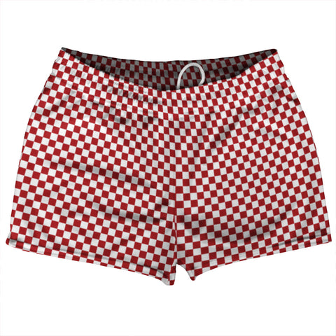 Product Story: Checkerboard Half Inch Red Dark and White Shorty Short Gym Shorts 2.5" Inseam Made In USAProduct Description: Checkerboard Half Inch Red Dark and White Shorty Short Gym Shorts 2.5" Inseam Made In USA Men's Short Shorts 2.5 Inseam No Pockets Athletic Microfiber Great For Inspiring Baby Making, Rugby, Running, Hoops, Racket Sports, Gym Class and Basket Weaving. Draw...