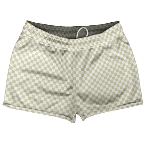 Product Story: Checkerboard Half Inch Vegas Gold and White Shorty Short Gym Shorts 2.5" Inseam Made In USAProduct Description: Checkerboard Half Inch Vegas Gold and White Shorty Short Gym Shorts 2.5" Inseam Made In USA Men's Short Shorts 2.5 Inseam No Pockets Athletic Microfiber Great For Inspiring Baby Making, Rugby, Running, Hoops, Racket Sports, Gym Class and Basket Weaving. Draw...