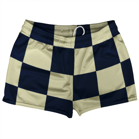 Product Story: Checkerboard 5 Inches Blue Navy and Vegas Gold Shorty Short Gym Shorts 2.5" Inseam Made In USAProduct Description: Checkerboard 5 Inches Blue Navy and Vegas Gold Shorty Short Gym Shorts 2.5" Inseam Made In USA Men's Short Shorts 2.5 Inseam No Pockets Athletic Microfiber Great For Inspiring Baby Making, Rugby, Running, Hoops, Racket Sports, Gym Class and Basket...
