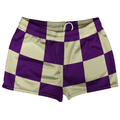 Product Story: Checkerboard 5 Inches Purple Medium and Vegas Gold Shorty Short Gym Shorts 2.5" Inseam Made In USAProduct Description: Checkerboard 5 Inches Purple Medium and Vegas Gold Shorty Short Gym Shorts 2.5" Inseam Made In USA Men's Short Shorts 2.5 Inseam No Pockets Athletic Microfiber Great For Inspiring Baby Making, Rugby, Running, Hoops, Racket Sports, Gym Class and Basket...