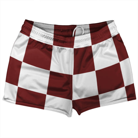 Product Story: Checkerboard 5 Inches Red Maroon and White Shorty Short Gym Shorts 2.5" Inseam Made In USAProduct Description: Checkerboard 5 Inches Red Maroon and White Shorty Short Gym Shorts 2.5" Inseam Made In USA Men's Short Shorts 2.5 Inseam No Pockets Athletic Microfiber Great For Inspiring Baby Making, Rugby, Running, Hoops, Racket Sports, Gym Class and Basket Weaving. Draw...