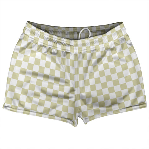 Product Story: Checkerboard 1 Inch Vegas Gold and White Shorty Short Gym Shorts 2.5" Inseam Made In USAProduct Description: Checkerboard 1 Inch Vegas Gold and White Shorty Short Gym Shorts 2.5" Inseam Made In USA Men's Short Shorts 2.5 Inseam No Pockets Athletic Microfiber Great For Inspiring Baby Making, Rugby, Running, Hoops, Racket Sports, Gym Class and Basket Weaving. Draw...