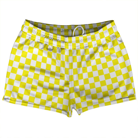 Product Story: Checkerboard 1 Inch Yellow Canary and White Shorty Short Gym Shorts 2.5" Inseam Made In USAProduct Description: Checkerboard 1 Inch Yellow Canary and White Shorty Short Gym Shorts 2.5" Inseam Made In USA Men's Short Shorts 2.5 Inseam No Pockets Athletic Microfiber Great For Inspiring Baby Making, Rugby, Running, Hoops, Racket Sports, Gym Class and Basket Weaving. Draw...