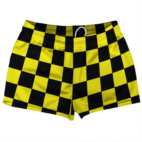 Product Story: Checkerboard 2.5 Inches Black and Yellow Shorty Short Gym Shorts 2.5" Inseam Made In USAProduct Description: Checkerboard 2.5 Inches Black and Yellow Shorty Short Gym Shorts 2.5" Inseam Made In USA Men's Short Shorts 2.5 Inseam No Pockets Athletic Microfiber Great For Inspiring Baby Making, Rugby, Running, Hoops, Racket Sports, Gym Class and Basket Weaving. Draw String Durable...