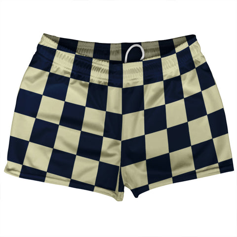 Product Story: Checkerboard 2.5 Inches Blue Navy and Vegas Gold Shorty Short Gym Shorts 2.5" Inseam Made In USAProduct Description: Checkerboard 2.5 Inches Blue Navy and Vegas Gold Shorty Short Gym Shorts 2.5" Inseam Made In USA Men's Short Shorts 2.5 Inseam No Pockets Athletic Microfiber Great For Inspiring Baby Making, Rugby, Running, Hoops, Racket Sports, Gym Class and Basket...