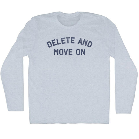 Product Story: Delete And Move On Adult Tri-Blend Long Sleeve T-shirtProduct Description: Delete And Move On Adult Tri-Blend Long Sleeve T-shirt Tri-Blend (Polyester, Rayon, Cotton) Buttery Smooth Soft Material Medium Weight Tee Soft Hand Print