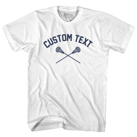 Product Story: Custom Text Crossed Lacrosse Sticks Adult Cotton T-shirtProduct Description: Custom Text Crossed Lacrosse Sticks Adult Cotton T-shirt Cotton (90% Cotton &10% Polyester) Buttery Smooth Soft Material Medium Weight Tee Soft Hand Print