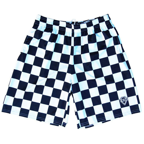 Product Story: Checkerboard Lacrosse Shorts. Product Description: Fleece Sweat Shorts Lacrosse Shorts 100% Polyester Sublimated Made in USA Premium Lacrosse Product Side Pockets Elastic Drawstring Waist Youth 7 Inch Inseam, Adult 9 Inch Inseam