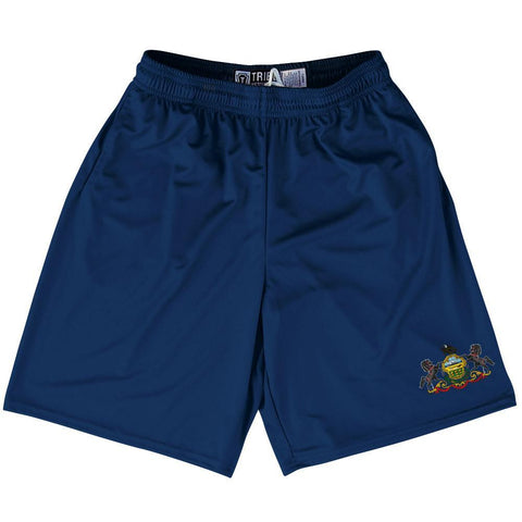 Product Story: Pennsylvania State Flag 9" Inseam Lacrosse Shorts. Seam Breaks Above KneeProduct Description: Pennsylvania State Flag 9" Inseam Lacrosse Shorts Forever Color Sharpness 9 Inch Inseam Side Pockets Athletic Microfiber Great Sports Shorts Elastic Waist Draw String Athletic Polyester Material Moisture Wicking Material