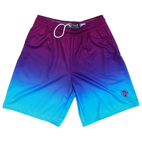 Product Story: Purple & Cyan Ombre Lacrosse Shorts Product Description: Purple & Cyan Ombre Lacrosse Shorts 100% Polyester Unisex Sublimated Premium Lacrosse Product Elastic Drawstring Waist Made in USA