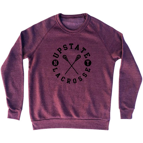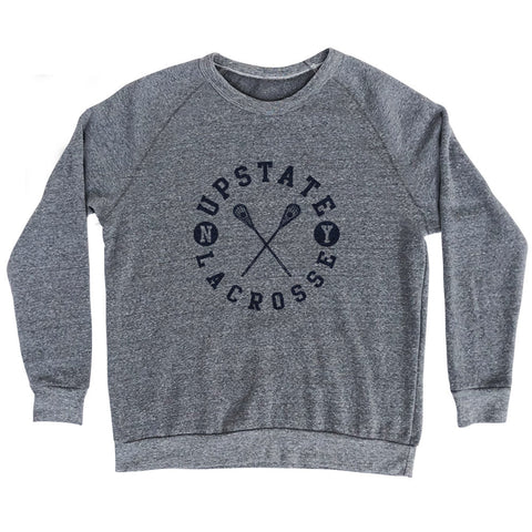 Product Story: Upstate Ny Lacrosse Adult Tri-Blend SweatshirtProduct Description: Upstate Ny Lacrosse Adult Tri-Blend Sweatshirt Tri-Blend (Polyester, Rayon, Cotton) Buttery Smooth Soft Material Medium Weight Tee Soft Hand Print