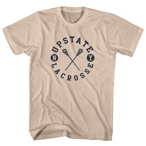 Product Story: Upstate Ny Lacrosse Adult Cotton T-ShirtProduct Description: Upstate Ny Lacrosse Adult Cotton T-Shirt Cotton Buttery Smooth Soft Material Medium Weight Tee Soft Hand Print