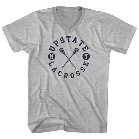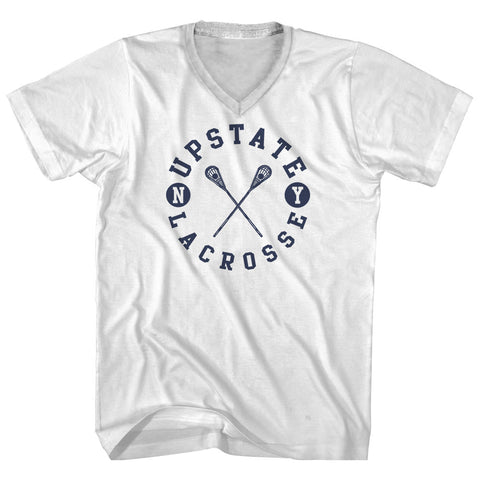 Product Story: Upstate Ny Lacrosse Adult Cotton V-Neck T-ShirtProduct Description: Upstate Ny Lacrosse Adult Cotton V-Neck T-Shirt Tri-Blend (Polyester, Rayon, Cotton) Buttery Smooth Soft Material Medium Weight Tee Soft Hand Print