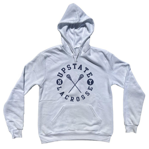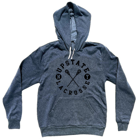 Product Story: Upstate Ny Lacrosse Cotton-Poly Blend HoodieProduct Description: Upstate Ny Lacrosse Cotton-Poly Blend Hoodie 6.5 oz. Tri-Blend Cozy Soft Material Pre-Shrunk Set-in sleeves Pouch front pocket Ribbed bottom band and sleeve cuffs