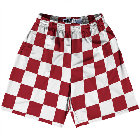 Product Story: Checkerboard 2.5 Inches Red Maroon and White Lacrosse Shorts Made In USAProduct Description: Checkerboard 2.5 Inches Red Maroon and White Lacrosse Shorts Made In USA Athletic Material Lacrosse Shorts Premium Lacrosse Product Made in USA