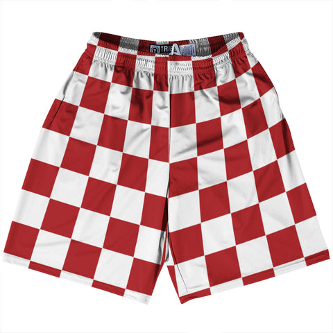 Product Story: Checkerboard 2.5 Inches Red Cardinal and White Lacrosse Shorts Made In USAProduct Description: Checkerboard 2.5 Inches Red Cardinal and White Lacrosse Shorts Made In USA Athletic Material Lacrosse Shorts Premium Lacrosse Product Made in USA
