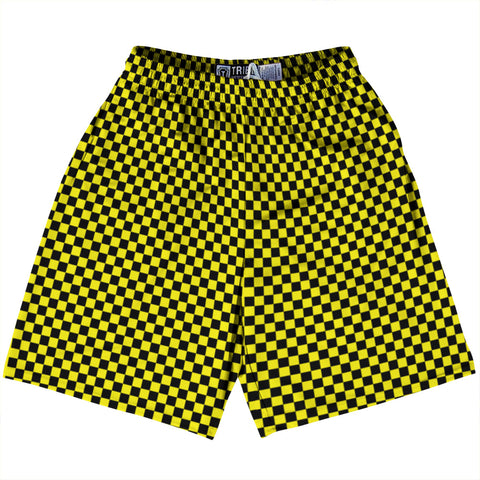 Product Story: Checkerboard Half Inch Black and Yellow Lacrosse Shorts Made In USAProduct Description: Checkerboard Half Inch Black and Yellow Lacrosse Shorts Made In USA Athletic Material Lacrosse Shorts Premium Lacrosse Product Made in USA