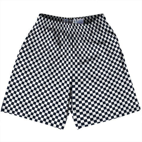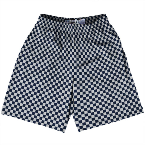 Product Story: Checkerboard Half Inch Blue Navy Almost Black and White Lacrosse Shorts Made In USAProduct Description: Checkerboard Half Inch Blue Navy Almost Black and White Lacrosse Shorts Made In USA Athletic Material Lacrosse Shorts Premium Lacrosse Product Made in USA