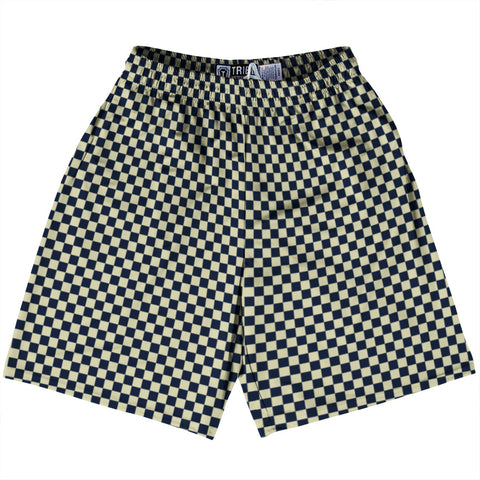 Product Story: Checkerboard Half Inch Blue Navy and Vegas Gold Lacrosse Shorts Made In USAProduct Description: Checkerboard Half Inch Blue Navy and Vegas Gold Lacrosse Shorts Made In USA Athletic Material Lacrosse Shorts Premium Lacrosse Product Made in USA