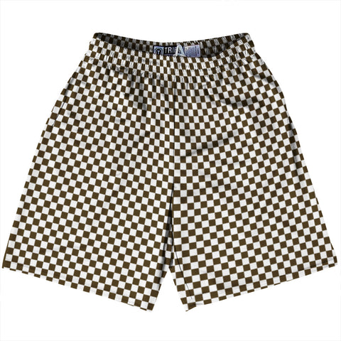 Product Story: Checkerboard Half Inch Brown Dark and White Lacrosse Shorts Made In USAProduct Description: Checkerboard Half Inch Brown Dark and White Lacrosse Shorts Made In USA Athletic Material Lacrosse Shorts Premium Lacrosse Product Made in USA