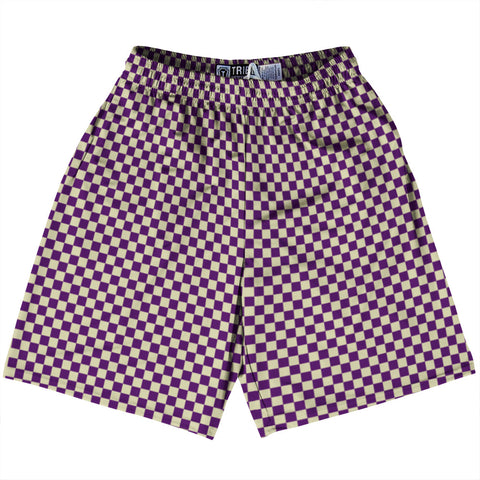 Product Story: Checkerboard Half Inch Purple Lakers and White Lacrosse Shorts Made In USAProduct Description: Checkerboard Half Inch Purple Lakers and White Lacrosse Shorts Made In USA Athletic Material Lacrosse Shorts Premium Lacrosse Product Made in USA