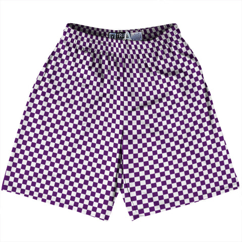 Product Story: Checkerboard Half Inch Purple Medium and White Lacrosse Shorts Made In USAProduct Description: Checkerboard Half Inch Purple Medium and White Lacrosse Shorts Made In USA Athletic Material Lacrosse Shorts Premium Lacrosse Product Made in USA