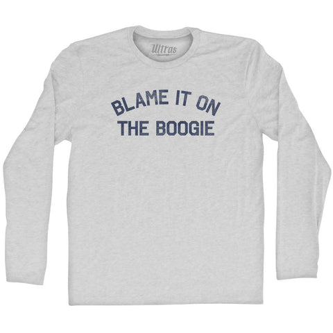 Product Story: Blame It On The Boogie Adult Tri-Blend Long Sleeve T-shirtProduct Description: Blame It On The Boogie Adult Tri-Blend Long Sleeve T-shirt Tri-Blend (Polyester, Rayon, Cotton) Buttery Smooth Soft Material Medium Weight Tee Soft Hand Print