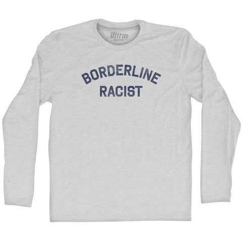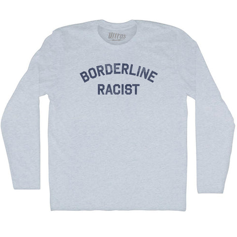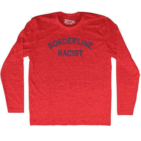 Product Story: Borderline Racist Adult Tri-Blend Long Sleeve T-shirtProduct Description: Borderline Racist Adult Tri-Blend Long Sleeve T-shirt Tri-Blend (Polyester, Rayon, Cotton) Buttery Smooth Soft Material Medium Weight Tee Soft Hand Print