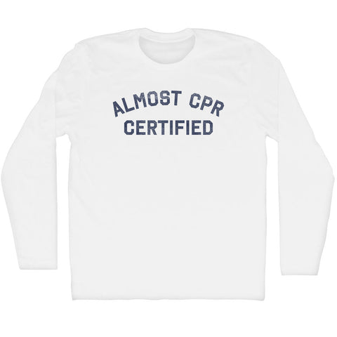 Product Story: Almost CPR Certified Adult Cotton Long Sleeve T-shirtProduct Description: Almost CPR Certified Adult Cotton Long Sleeve T-shirt Cotton Buttery Smooth Soft Material Medium Weight Tee Soft Hand Print