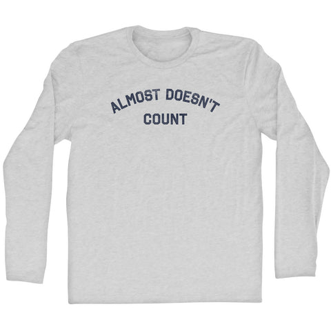 Product Story: Almost Doesn't Count Adult Tri-Blend Long Sleeve T-shirtProduct Description: Almost Doesn't Count Adult Tri-Blend Long Sleeve T-shirt Tri-Blend (Polyester, Rayon, Cotton) Buttery Smooth Soft Material Medium Weight Tee Soft Hand Print