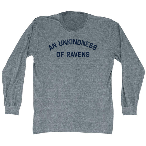 Product Story: An Unkindness Of Ravens Adult Tri-Blend Long Sleeve T-shirtProduct Description: An Unkindness Of Ravens Adult Tri-Blend Long Sleeve T-shirt Tri-Blend (Polyester, Rayon, Cotton) Buttery Smooth Soft Material Medium Weight Tee Soft Hand Print