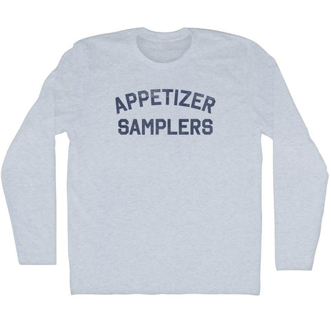 Product Story: Appetizer Samplers Adult Tri-Blend Long Sleeve T-ShirtProduct Description: Appetizer Samplers Adult Tri-Blend Long Sleeve T-Shirt Tri-Blend (Polyester, Rayon, Cotton) Buttery Smooth Soft Material Medium Weight Tee Soft Hand Print