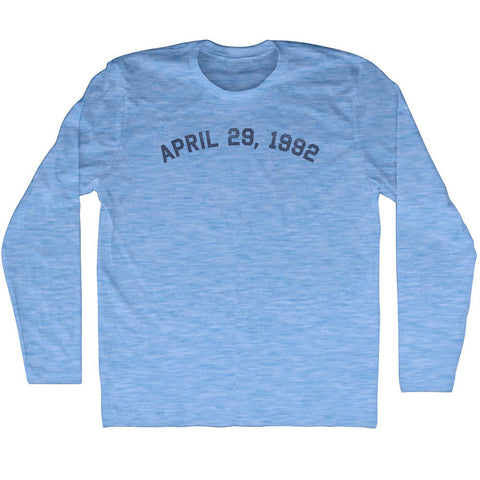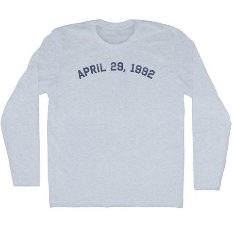 Product Story: April 29, 1992 Adult Tri-Blend Long Sleeve T-shirtProduct Description: April 29, 1992 Adult Tri-Blend Long Sleeve T-shirt Tri-Blend (Polyester, Rayon, Cotton) Buttery Smooth Soft Material Medium Weight Tee Soft Hand Print