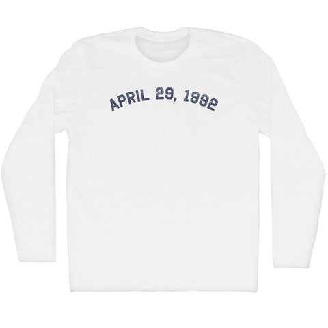 Product Story: April 29, 1992 Adult Cotton Long Sleeve T-shirtProduct Description: April 29, 1992 Adult Cotton Long Sleeve T-shirt Cotton (90% Cotton &10% Polyester) Buttery Smooth Soft Material Medium Weight Tee Soft Hand Print