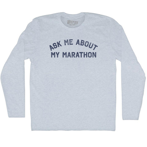 Product Story: Ask Me About My Marathon Adult Tri-Blend Long Sleeve T-shirtProduct Description: Ask Me About My Marathon Adult Tri-Blend Long Sleeve T-shirt Tri-Blend (Polyester, Rayon, Cotton) Buttery Smooth Soft Material Medium Weight Tee Soft Hand Print