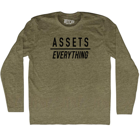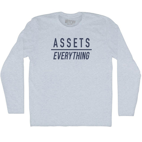 Product Story: Assets Over Liabilities Adult Tri-Blend Long Sleeve T-shirtProduct Description: Assets Over Liabilities Adult Tri-Blend Long Sleeve T-shirt Tri-Blend (Polyester, Rayon, Cotton) Buttery Smooth Soft Material Medium Weight Tee Soft Hand Print