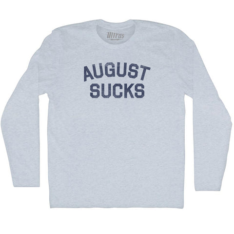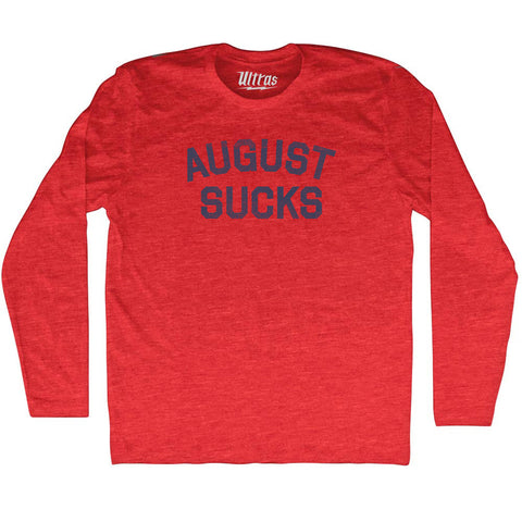 Product Story: August Sucks Adult Tri-Blend Long Sleeve T-shirtProduct Description: August Sucks Adult Tri-Blend Long Sleeve T-shirt Tri-Blend (Polyester, Rayon, Cotton) Buttery Smooth Soft Material Medium Weight Tee Soft Hand Print