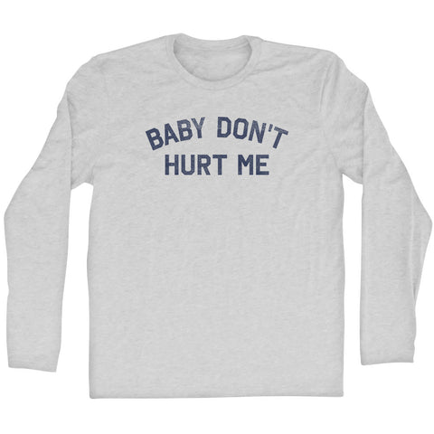 Product Story: Baby Don't Hurt Me Adult Tri-Blend Long Sleeve T-shirtProduct Description: Baby Don't Hurt Me Adult Tri-Blend Long Sleeve T-shirt Tri-Blend (Polyester, Rayon, Cotton) Buttery Smooth Soft Material Medium Weight Tee Soft Hand Print