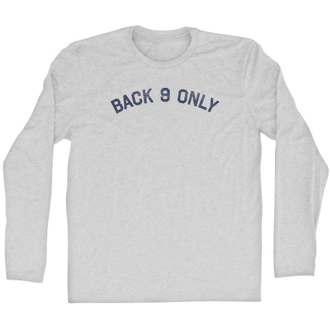 Product Story: Back 9 Only Adult Tri-Blend Long Sleeve T-shirtProduct Description: Back 9 Only Adult Tri-Blend Long Sleeve T-shirt Tri-Blend (Polyester, Rayon, Cotton) Buttery Smooth Soft Material Medium Weight Tee Soft Hand Print